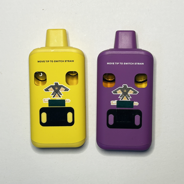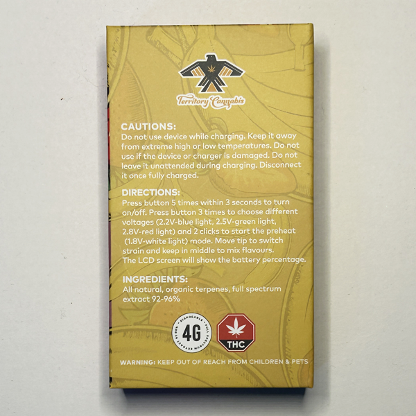 Territory Cannabis has hit it out the park with this remarkable new product. Each vape pen contains four grams total of full spectrum live resin and liquid diamonds, consisting of two grams indica and two grams sativa. By shifting the intake at the top left or right, you can choose to toke on the indica flavour, the sativa flavour, or get a hybrid of the two by keeping it in the middle!